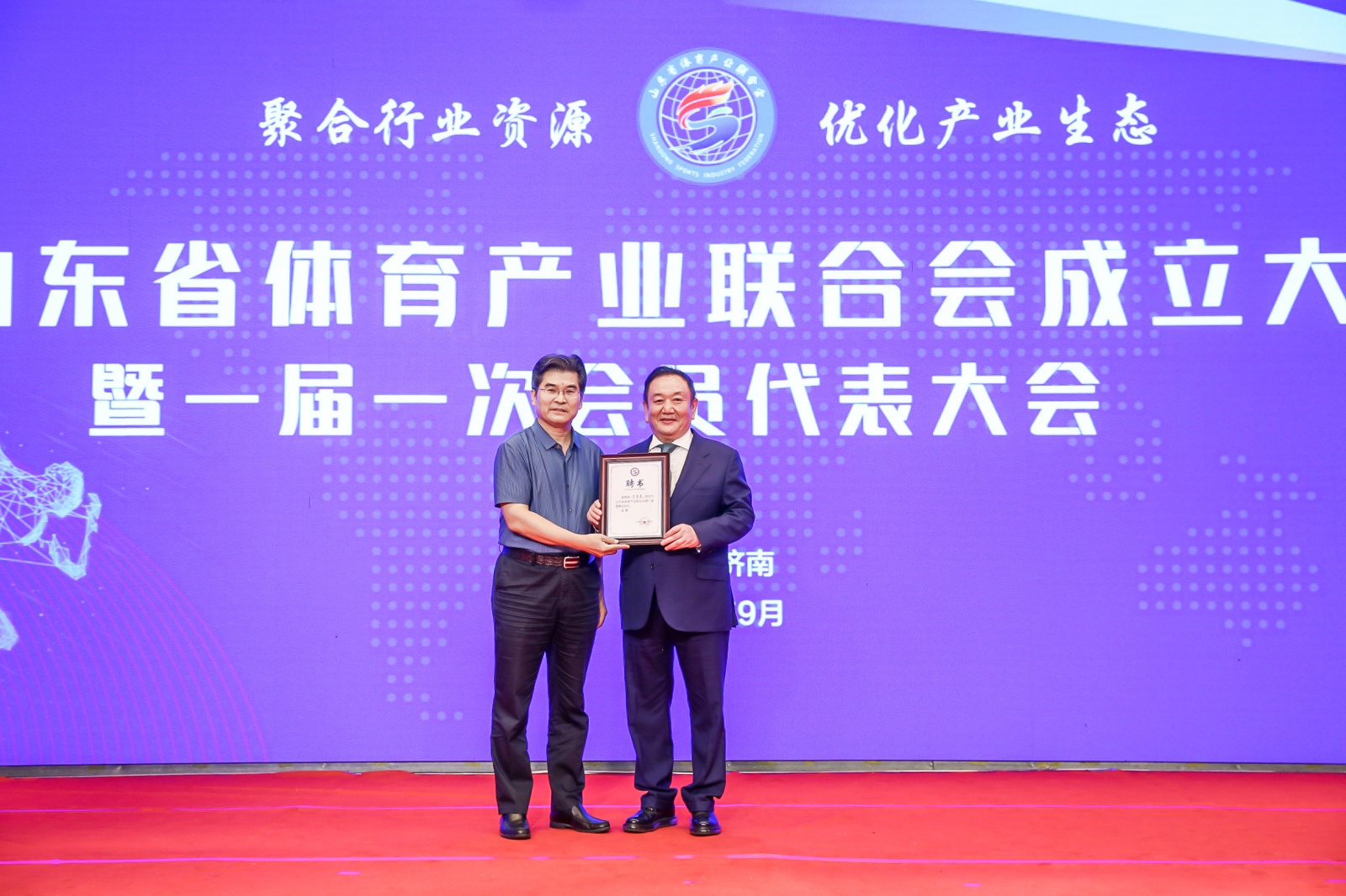 2020年9月16日,山东省体育产业联合会成立大会暨一届一次会员代表大会在山东济南隆重召开。中国体育用品业联合会主席李桦、山东省体育局副局长王延奎、中国文教体育用品协会副理事长张培生、中国体育用品业联合会副主席兼秘书长罗杰、山东省民政厅社会组织管理局二级调研员王军、山东省体育总会秘书处处长孙照亮、山东省体育局经济处处长徐金龙、山东省体育产业发展服务中心主任翟培建出席。山东省体育产业联合会近200名会员单位代表以及部分省市媒体共同参加。全国政协委员、好博体育体育产业集团董事长卞志良当选首届理事会会长并发表讲话。