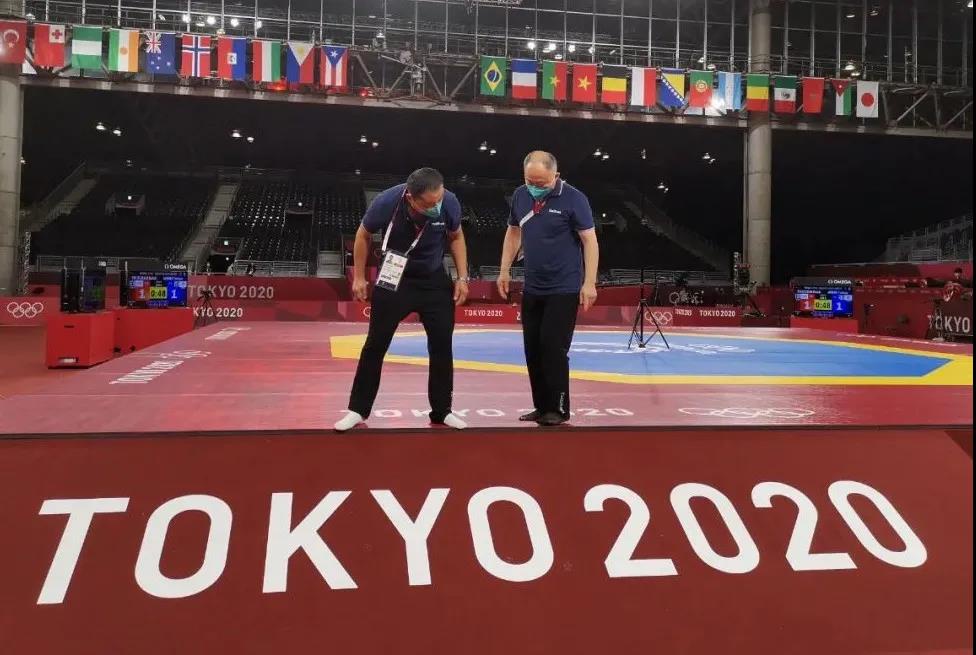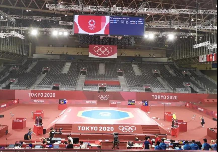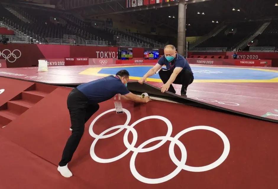 2021年7月20日,日本武道馆——奥运会柔道比赛场地。好博体育体育东京奥运会服务保障团队正在布置、安装柔道器材。