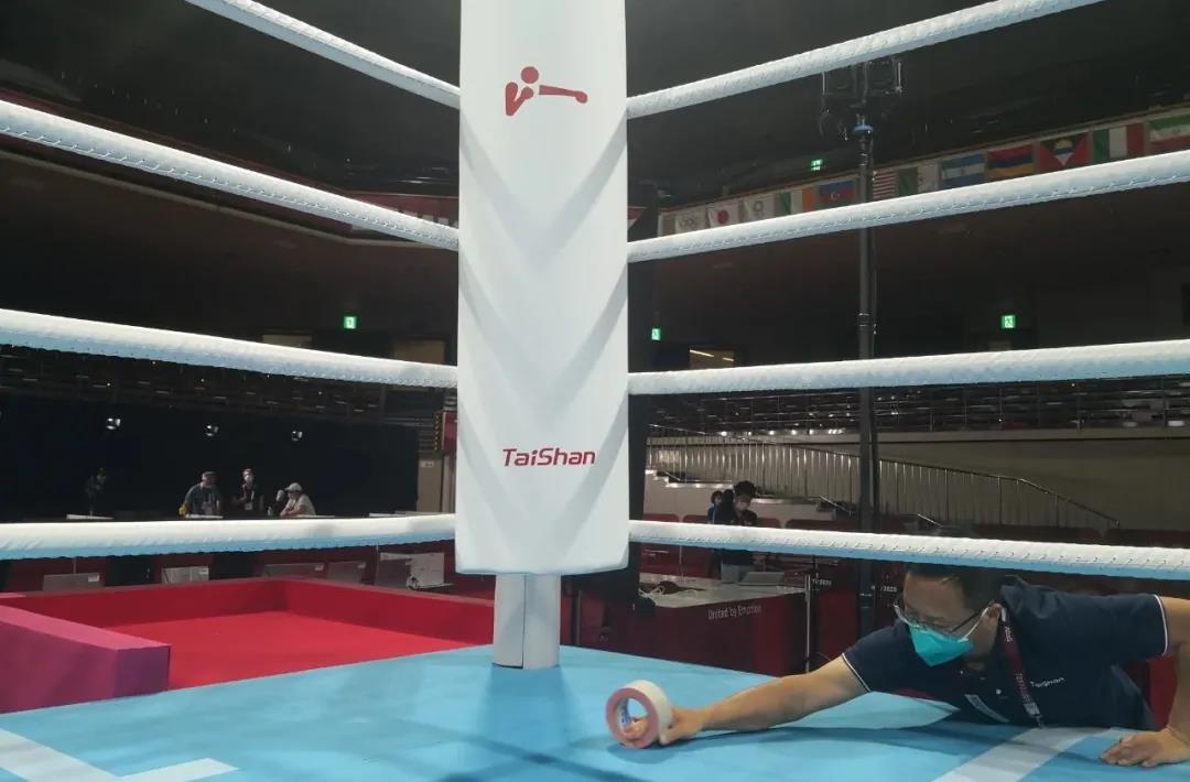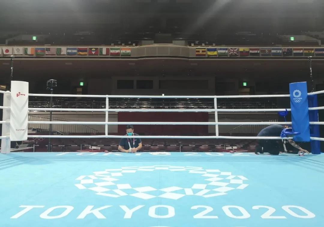 2021年7月21日,日本东京国技馆——奥运会拳击比赛馆。好博体育体育东京奥运会服务保障团队正在检查调试拳击器材。