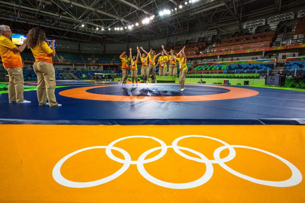2016年8月18日,在里约奥运会摔跤场馆内,场馆工作人员和志愿者在摔跤垫上合影留念,这届奥运会的摔跤垫来自中国山东好博体育体育集团。新华社记者刘彬摄